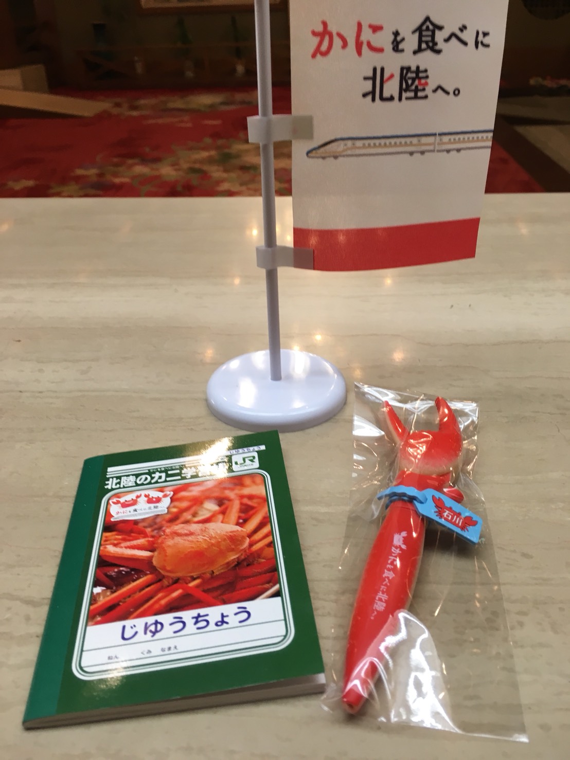 かわいいタグ付(笑)カニボールペンまたはミニノートを「ズワイガニ料理」をSNSにアップしていただいたお客様に先着各100名様プレゼントいたします。かにキャンペーンも本日より開催しております。アップされましたお客様はフロントにて確認、お渡しさせていただいております(^_^.)