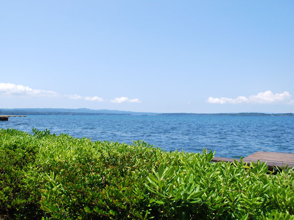 本日の中庭からの海の景色、海も真っ青で気持ちいい!