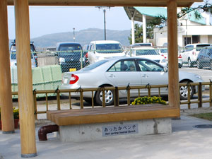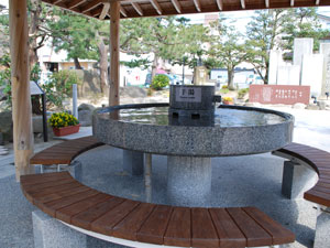 この公園が和倉で大切な場所である所以は、和倉温泉の源泉が出ているからでございまして、このほどの改修でその源泉を使用した施設がいくつか造られました。今までは温泉卵を作れる源泉のみでしたが、あらたに写真にございます「手湯」(手を温泉で温めます)と「あったかベンチ」(ベンチの椅子の中に源泉が通って!ます)が設置され、観光客、街の人の憩いの場として人気を呼んでます。